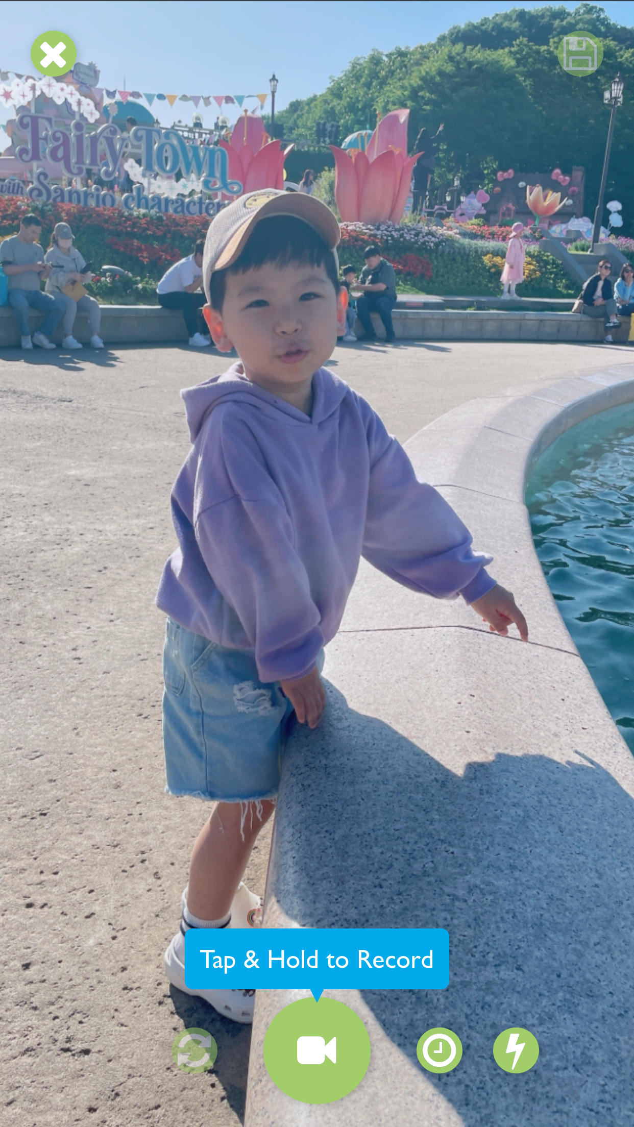 Record directly with the camera function . Record segments by pressing the button -> Combine segments into a single video upon final save . Timer available for automatic recording activation in case you can't press the button Add music to already saved videos